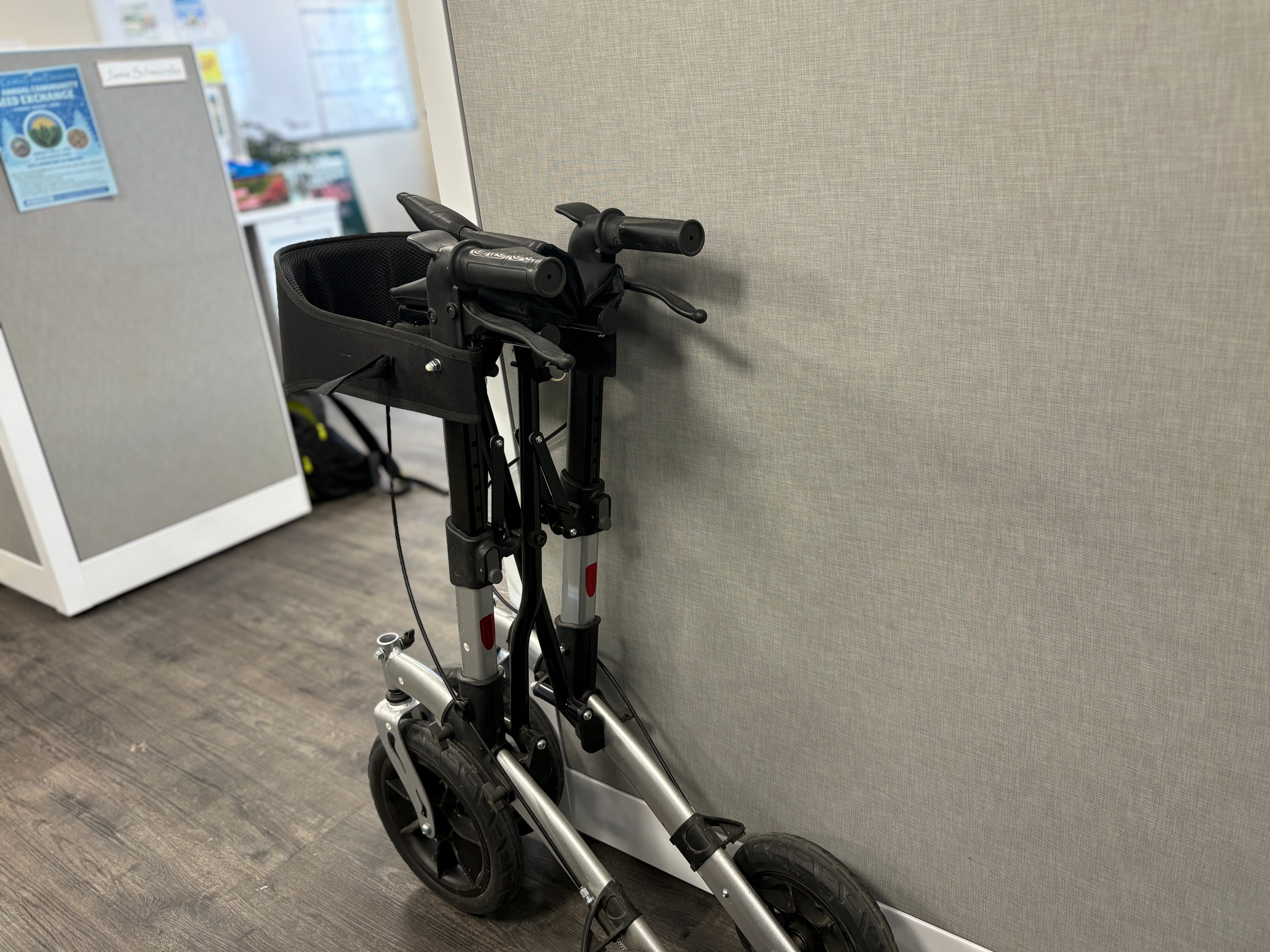 Look at my beautiful new rollator. Her name is Jonesy. My friend Kathleen found her for me at Salt and Light. She also told me not to name it after her. Heh. Look how neatly she folds up too!