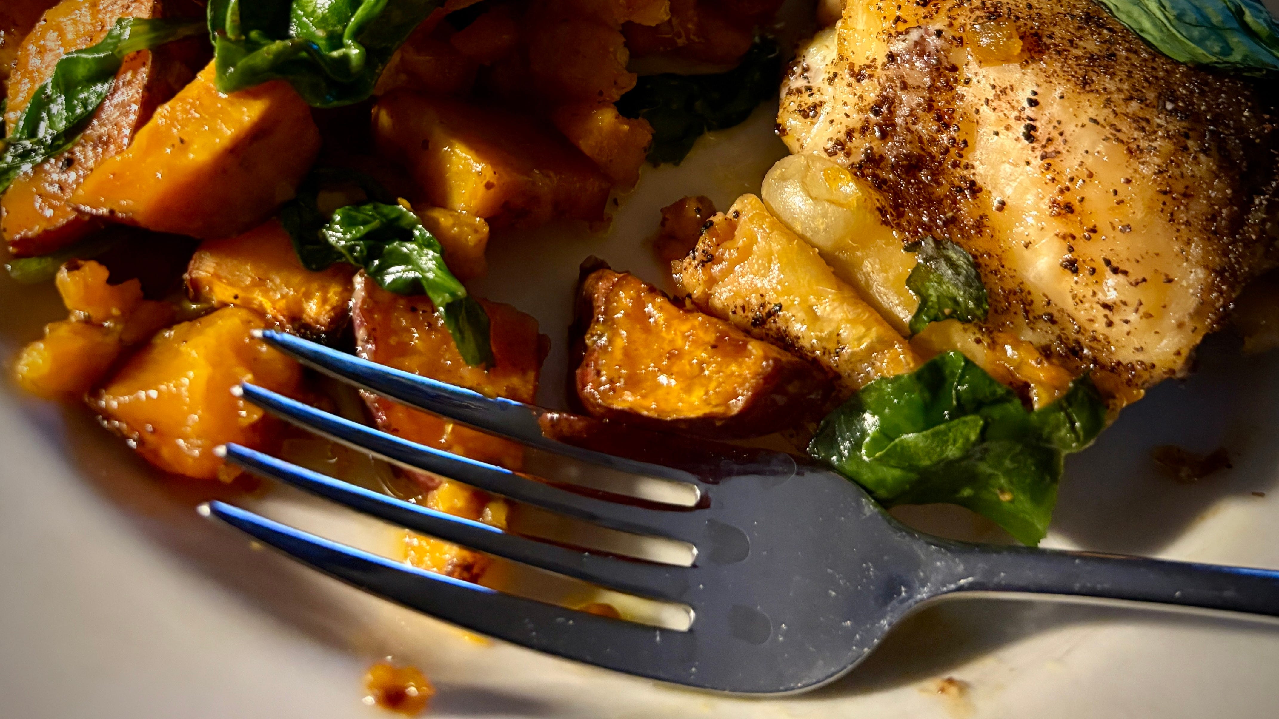 Our standard chicken thighs, sweet potatoes and greens.